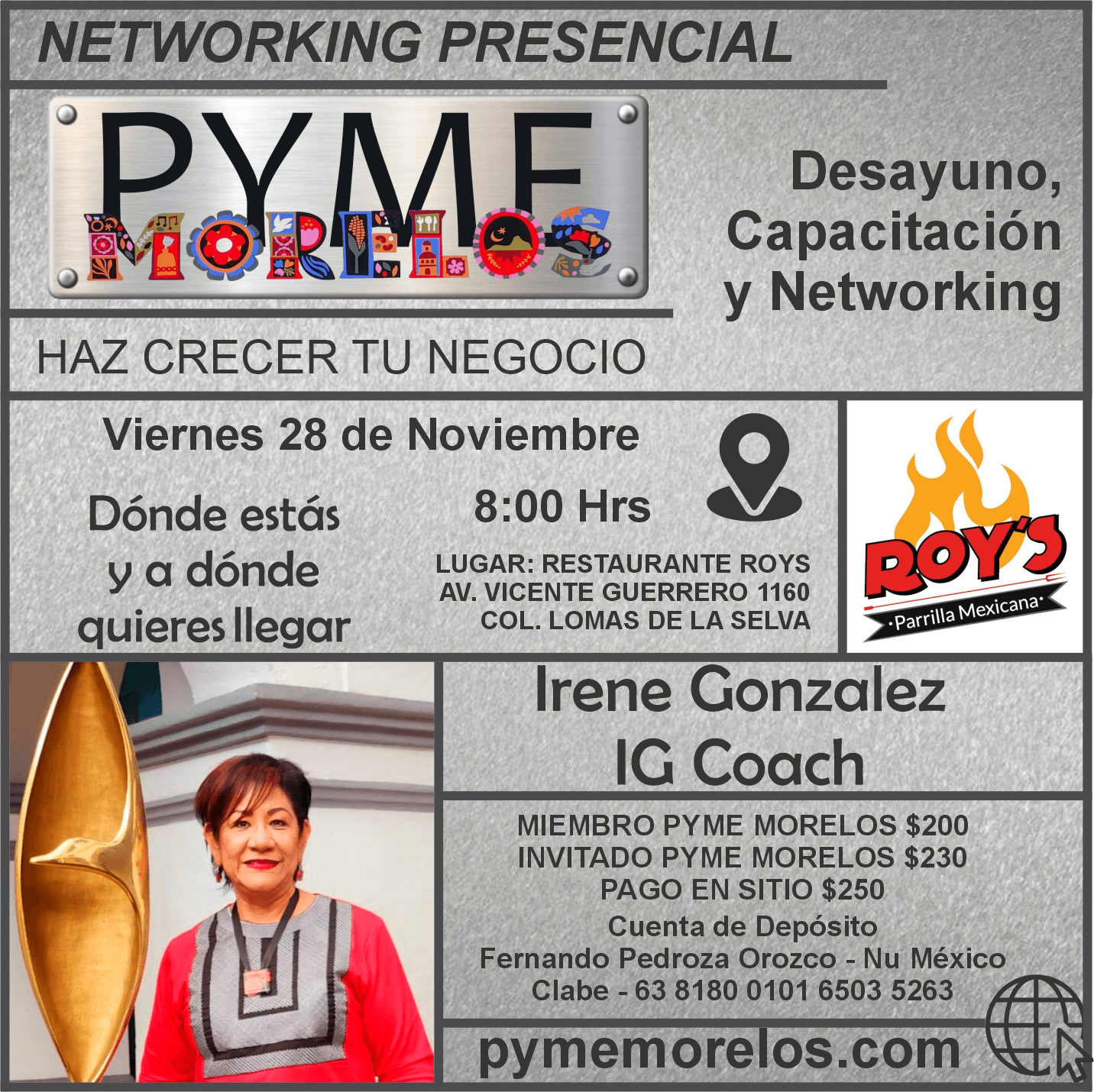 Sede: Restaurante Roy’s — Av. Vicente Guerrero 1160, Col. Lomas de la Selva, Cuernavaca.